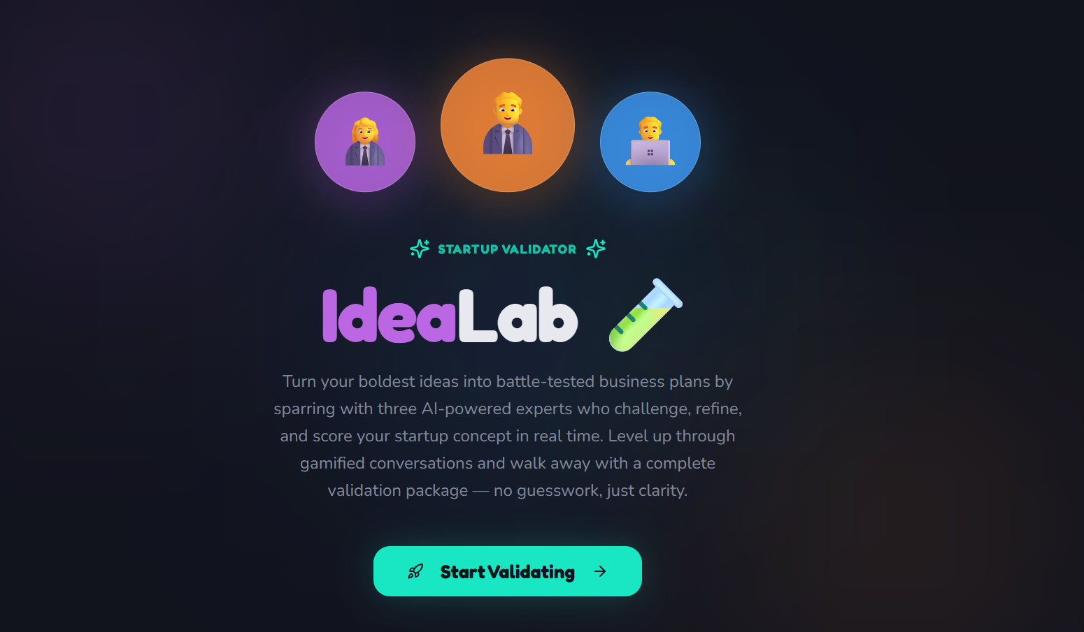 Validate your startup idea in minutes by chatting with three AI experts who stress-test your market, strategy, and product plan. Earn XP, crush objections, and walk away with a complete business plan package.