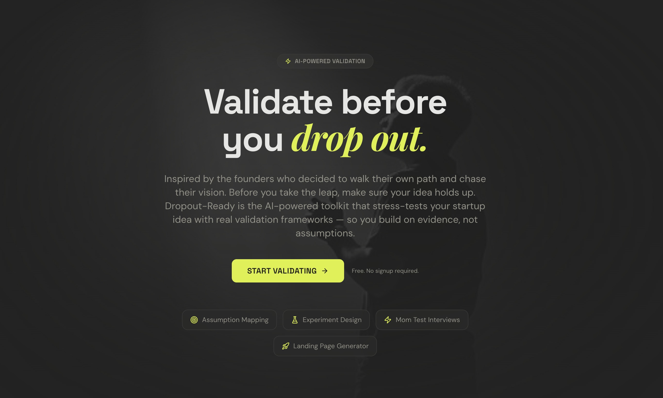 Dropout-Ready is the AI-powered toolkit that stress-tests your startup idea with real validation frameworks, so you build on evidence, not assumptions.
